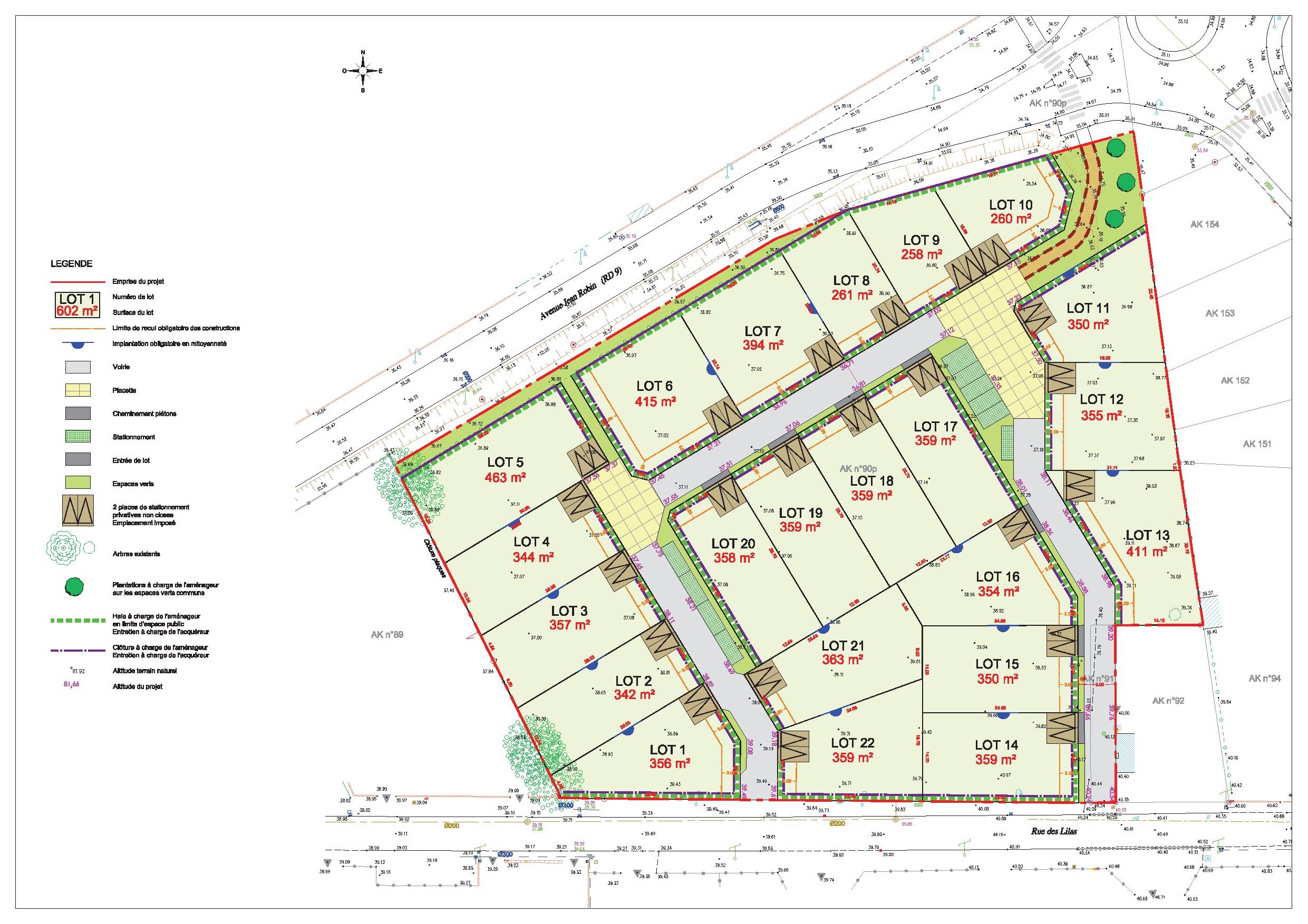 propose 22 terrains à bâtir viabilisés de 258m² à 463m².